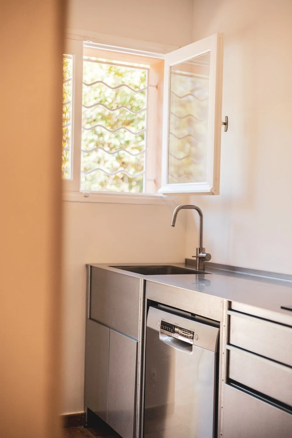 Imagine cheering crickets, fresh croissants, rosé wine until sunset and fresh herbs on the BBQ in the authentic 70’s mediterranean villa… 200 meters away from the beach…Kitchen & bathroom furniture in stainless steel.